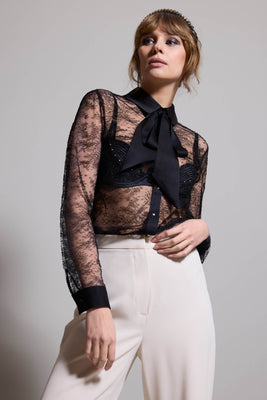 Indulge in understated elegance with our new Celeste designer Lace Bodysuit, a masterpiece of delicate sensuality and couture-level craftsmanship. Handcrafted from exquisite French Dentelle de Calais-Caudry® lace in a soft, barely-there oyster blush hue, if features a detachable pussy bow in matching silk georgette satin.